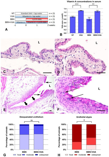 Treatment regiments, vitamin A serum concentrations, and histopathological changes in urothelium after N-butyl-N-(4-hydroxybutyl) nitrosamine (BBN) treatment and vitamin A rich diet: (A) Four groups of animals treated with standard diet (NT), vitamin A rich diet (VitA), BBN in drinking water (BBN), and BBN in drinking water and vitamin A rich diet (BBN + VitA); (B) vitamin A serum concentrations of NT (n = 6), VitA (n = 6), BBN (n = 9), and BBN + VitA (n = 9) groups of animals (tested by ANOVA, F-test, and two-sided Student’s t-test; *** p = 0.0001, ** p = 0.0011). Hematoxylin and eosin staining: Normal urothelium of (C) NT group and (D) VitA group showing characteristic three-layered urothelium with superficial umbrella cells; (E) desquamated urothelium (thin arrows) in BBN group with denuded basal lamina and lamina propria (thick arrows). Similar areas were observed in BBN + VitA group; (F) urothelium of BBN + VitA group with large pleomorphic and hyperchromatic nuclei with conspicuous nucleoli and irregular contours (thin arrows), with nuclear crowding (dashed ellipse) and loss of cell polarity, characteristic of urothelial atypia. Similar areas, but even more widespread, were observed in BBN group. L, lumen of the bladder. Scale bars = 50 μm. Histopathological evaluation of (G) desquamated urothelium and (H) urothelial atypia in BBN (n = 21) and BBN + VitA (n = 21) groups (tested by ANOVA, F-test, and two-sided Student’s t-test; * p < 0.05; ns, no statistically significant difference). In NT (n = 21) and VitA (n = 21) groups, the percentage of animals with desquamation of urothelium or urothelial atypia was zero.