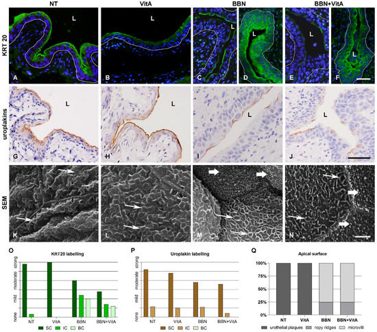 Keratin 20 (KRT20), uroplakins, and rigid-looking (scalloped) apical surface confirmed terminal differentiation of urothelium in the NT and VitA groups (Figure 2A,B,G,H,K,L). KRT20 revealed two characteristic patterns: (i) Individual superficial urothelial cells with positive labelling in the apical cytoplasm (Figure 2C–F,I,J); and (ii) positive labelling in the cytoplasm of superficial, intermediate, and basal cells (Figure 2D,F) in the BBN and BBN + VitA groups. Uroplakins showed individual superficial cells with positive reaction in the apical cytoplasm in the BBN and BBN + VitA groups (Figure 2I,J). The apical plasma membrane of NT and VitA groups exhibited urothelial plaques characteristic of terminally differentiated cells (Figure 2K,L), while the apical surface of BBN and BBN + VitA groups was covered by ropy ridges and microvilli, which are characteristic of partially differentiated urothelial cells (Figure 2M,N). Quantitative evaluation of these three differentiation markers confirmed a lower differentiation stage of urothelial cells in BBN and BBN + VitA groups in comparison to NT and VitA groups (Figure 2O–Q). There was no change in the differentiation stage between BBN and BBN + VitA groups.