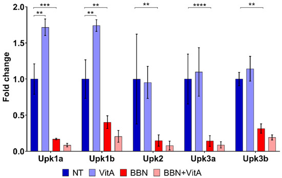Transcriptional expression profiles of uroplakin genes (Upk1a, Upk1b, Upk2, Upk3a, and Upk3b) in the bladder wall of four groups of animals: NT (n = 9), VitA (n = 6), BBN (n = 9), BBN + VitA (n = 9). Statistical analysis was performed using ANOVA followed by Tukey’s post hoc test; ** p < 0.005, *** p < 0.0005, **** p < 0.0001.