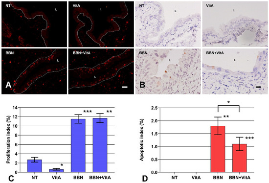 Proliferation and apoptosis of urothelial cells. (A) Ki-67 immunofluorescence (red) for identification of proliferating cells. Red nuclei are Ki-67 positive nuclei from proliferating cells; white line depicts the location of basal lamina. L, lumen. Scale bar = 50 μm. (B) Active caspase-3 immunohistochemistry (brown) for identification of apoptotic cells. Brown cells are active caspase-3 positive cells dying via apoptosis. Scale bar = 50 μm. (C) Proliferation indices of urothelial cells in NT (n = 6), VitA (n = 6), BBN (n = 12), BBN + VitA (n = 12). Statistically significant differences (tested by ANOVA, F-test, and two-sided Student’s t test) were determined between NT and VitA (* p = 0.0062) and between NT and BBN (*** p = 2.22 × 10−9) and VitA and BBN + VitA (** p = 3.98 × 10−9). There was no statistically significant difference between BBN and BBN + VitA; (D) apoptotic index of urothelial cells in NT (n = 6), VitA (n = 6), BBN (n = 12), BBN + VitA (n = 12). Statistically significant differences (tested by ANOVA, F-test, and two-sided Student’s t test) were determined between NT and BBN (** p = 0.0032) and VitA and BBN + VitA (*** p = 0.00047), and between BBN and BBN + VitA (* p = 0.049).