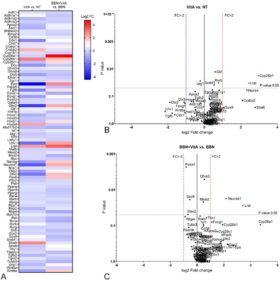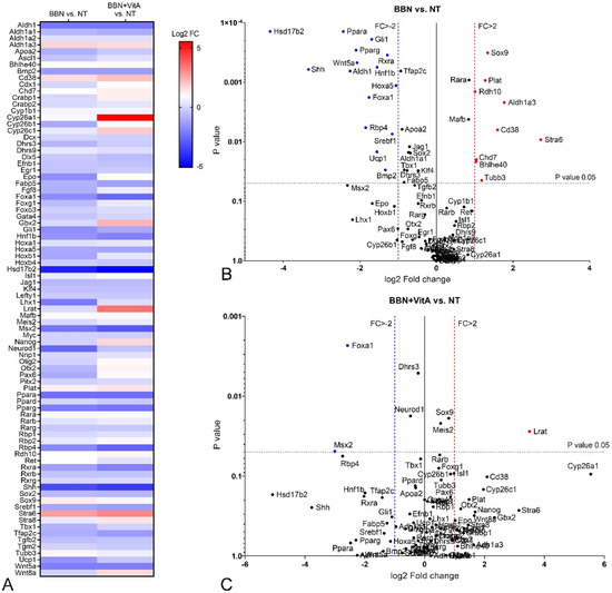 Differential expression of genes involved in retinoic acid signaling in mouse bladder tissue following BBN treatment and vitamin A rich diet. Comparisons of NT (n = 9), BBN (n = 9), and BBN + VitA (n = 9) groups of animals. (A) Heatmap representation of fold change in gene expression in BBN vs. NT and BBN + VitA vs. NT. (B,C) Volcano plots showing comparison of BBN vs. NT and BBN + VitA vs. NT. For each group, three cDNAs, each containing RNA from three different mice, were used. Significantly affected gene expression with fold change greater then 2, upregulated or downregulated, is marked in red or blue, respectively (p value < 0.05; tested by two-sided Student’s t-test). FC, fold change.