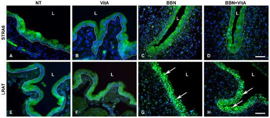 Immunofluorescence of proteins stimulated by retinoic acid 6 (STRA6) and lecithin retinol acyltransferase (LRAT). (A–D) STRA6 labelling (green) is strong in the cytoplasm of urothelial cells of all groups. Scale bar = 50 μm. LRAT labelling (green) is present in the cytoplasm of the normal urothelial in (E) NT and (F) VitA groups. In (G) BBN and (H) BBN + VitA groups, LRAT labelling is strongest in the nuclei of urothelial cells (arrows). White line depicts the location of basal lamina, L, lumen. Scale bar = 50 μm.