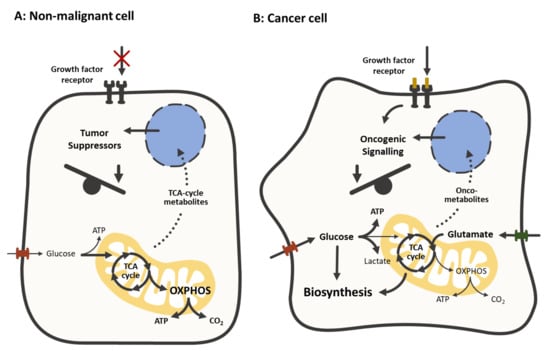 Figure 1. Comparison of the metabolism in non-malignant cells (A) and cancer cells (B) In most non-malignant cells, the absence of growth factor signaling, the limited supply of nutrients and the activity of tumor suppressors promotes oxidative phosphorylation (OXPHOS) in order to maximize the energetic yield. In cancer cells, growth factor signaling and oncogenes facilitate the transporter-mediated uptake of nutrients (e.g., glucose, glutamate) to supply a metabolic shift towards the biosynthesis of lipids, nucleotides and proteins. The TCA cycle serves as the main hub, connecting anabolic and catabolic processes by generating and providing intermediates. Metabolites and oncometabolites of the TCA cycle act as signaling molecules.