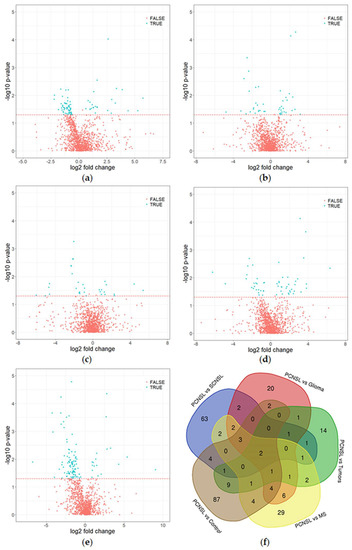 Volcano plots and Venn diagram of differential proteome analysis (discovery cohort). (a–e): The red line indicates a p-value of p = 0.05. Peptides marked as “true” (p < 0.05, turquoise) differed significantly in abundance between the PCNSL patients and respective groups, whereas proteins marked with “false” (red) exhibit no significant abundance change. (a) PCNSL vs. SCNSL, (b) PCNSL vs. glioma, (c) PCNSL vs. “other tumors”, (d) PCNSL vs. multiple sclerosis (MS), (e) PCNSL vs. non-tumor controls. (f) Venn diagram of significantly altered peptides.