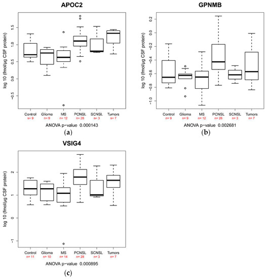 To obtain reliable quantification results, we screened our 33 candidate peptide biomarkers regarding their performance for SRM analysis considering oxidizable amino acids, missed cleavage sites as well as theoretical transition interference. Finally, we selected 19 peptides as likely suited for SRM analysis (Table 4). As we intended an absolute quantification approach (AQUA) based on SRM analysis, we considered 19 corresponding heavily labeled peptides of our candidate biomarkers. During the establishment of the SRM assay, we excluded 11 additional peptides as it turned out those peptides either did not provide a reasonable signal-to-noise ratio for quantification (eight peptides) or suffered from larger transition interferences under our experimental conditions (three peptides). Finally, eight peptides exhibited a good performance in the quantitative assays with concentrations in the range from 0.35 to 67.8 fmol/µg CSF protein (Table 5). For the validation of the candidate biomarkers, we used an independent patient cohort of 63 samples (Table S1B). The “other tumors” samples included samples from patients with meningeosis carcinomatosa (mammary carcinoma), desmoplastic medulloblastoma and rectal cancer cerebral metastasis. We revealed that under the chosen experimental set-up, three different peptides confirmed significant differences found in the discovery study (AYVPIAQVK from GPNMB, ANOVA p-value 0.0026; GSDPVTIFLR from VSIG4, ANOVA p-value 0.00089 and TAAQNLYEK from APOC2, ANOVA p-value 0.00014; Table 6, Figure 3). By Tukey’s post hoc tests, we revealed that these three candidate biomarkers exhibit significant differences in the comparison between PCNSL vs. glioma as well as PCNSL vs. MS (Table 6). As mentioned above and confirmed by our patient cohorts, MS is more frequently diagnosed at a younger age as compared with PCNSL. Therefore, we included age as a variable in the variance analysis and did not find a significant influence on peptide concentrations in CSF for AYVPIAQVK from GPNMB, GSDPVTIFLR from VSIG4 and TAAQNLYEK from APOC2 (p-values 0.79, 0.94 and 0.44, respectively). Although we have a high drop-off rate for peptide markers due to the reasons mentioned above, we successfully validated three candidate biomarkers in an independent patient cohort.