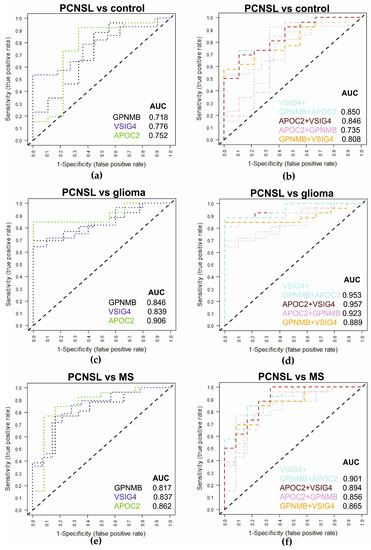 As the three candidate biomarkers revealed significant abundance changes in CSF between PCNSL and MS as well as glioma patients, respectively, we analyzed the candidate peptide biomarkers according to their diagnostic accuracy using our validation cohort sample set. ROC analysis of each marker peptide (Figure 4A,C,E) revealed that the individual marker peptides can discriminate PCNSL from the control patient samples (AUC: 0.718 GPNMB; 0.776 VSIG, 0.752 APOC). The discriminative power between PCNSL and glioma patients (AUC: 0.846 GPNMB; 0.839 VSIG, 0.906 APOC) as well as PCNSL and MS patients (AUC: 0.817 GPNMB; 0.837 VSIG, 0.862 APOC) was even better. Moreover, we determined the individual concentration cut-offs for the best diagnostic performance based on the data of the validation sample set as here absolute marker amounts were available. Based on the heavy labeled standard peptides comparing PCNSL with glioma patients, we obtained for AYVPIAQVK (GPNMB) a sensitivity of 69.2% and specificity of 88.8% by a cut-off of 0.0.32 fmol/µg. For the VSIG4 peptide GSDPVTIFLR, a sensitivity of 71.4% and specificity of 90.0% can be estimated at a cut-off of 36.2 fmol/µg protein and TAAQNLYEK (APOC2) can discriminate PCNSL from glioma patients at a cut-off of 8.3 fmol/µg with a sensitivity and specificity of 84.6% and 77.7%, respectively. For the comparison of PCNSL with MS patients, the sensitivities and specificities were 76.9%, and 83.3% (GPNMB, cut-off 0.29 fmol/µg), 78.6% and 78.6% (VSIG4, cut-off 27.5 fmol/µg) and 84.6% and 83.3% (APOC2, cut-off 8.3 fmol/µg). PCNSL patients could further be discriminated from non-tumor controls with sensitivities and specificities of 65.4% and 66.6% (GPNMB, cut-off 0.37 fmol/µg), 64.3% and 72.7% (VSIG4, cut-off 40,7 fmol/µg) and 73.1% and 77.8% (APOC2, cut-off 10.9 fmol/µg). Next, we tested if the combination of the candidate biomarkers can improve the discriminative power [20]. Thus, we demonstrated that the combination of two or all three candidate biomarkers improved the discrimination power in all cases (Figure 4B,D,E). For the comparison of PCNSL with the control patient samples, the combination of all three markers (APOC2/GPNMB/VSIG4) resulted in an AUC of 0.850 and the combination of VSIG1 and APOC2 in an AUC of 0.846. A significant improvement in discriminative power was reached for the comparison of PCNSL and glioma samples (APOC2/GPNMB/VSIG4: AUC 0.953, APOC2/VSIG: 0.957) and PCNSL and MS samples (APOC2/GPNMB/VSIG4: AUC 0.901, APOC2/VSIG: 0.894).
