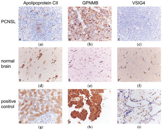 Thus, these proof-of-principle studies demonstrate that resident brain cell populations, i.e., astrocytes, microglia and neurons, account for GPNMB, apolipoprotein CII and VSIG4 expression, whereas only GPNMB was expressed in a significant fraction of PCNSL by the tumor cells.