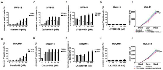 FLT3 inhibitors induce apoptosis in leukemic cells with FLT3-ITD while LY2510924 blocks surface CXCR4 and inhibits proliferation rather than causing apoptosis. (A,B) Both MV4–11 (A,C,E,G) and MOLM-14 (B,D,F,H) cells were cultured with different concentrations of sorafenib (A,B) and quizartinib (C,D) for 24 and 48 h, or LY2510924 (E,F) for 150 min. Both MV4–11 and MOLM-14 cells (3 × 104/mL) were grown in 2% fetal bovine serum containing RPMI in the presence or absence of 100 ng/mL CXCL12, with or without daily treatment with 1 µM LY2510924 for up to seven days. Flow cytometry using annexin V+/DAPI+ staining and counting beads was used to assess the percentage or number of apoptotic cells (A–D,G–J). Surface CXCR4 was measured by flow cytometry with antibody 12G5 (E,F), which was blocked by receptor occupancy with LY2510924. The results are expressed as the percentage change in mean fluorescent intensity (MFI) compared to control (untreated) cells. All results are expressed as the mean ± SD. * p < 0.05, ** p < 0.01.