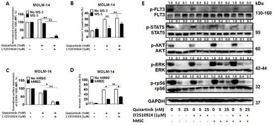 MOLM-14 cells were co-cultured with MS-5 or primary human mesenchymal stromal cells (hMSC). After 72 h of incubation at 37 °C in a humidified atmosphere containing 5% CO2, co-cultured cells were harvested and apoptotic MOLM-14 cells were quantified by flow cytometry. For immunoblotting, after four hours of incubation, the MOLM-14 cells were harvested and their lysates were analyzed by immunoblotting for FLT3, STAT5, ERK, S6K, and AKT as described above.