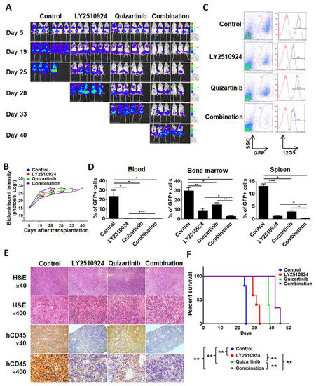 2.3. LY2510924 Enhances Anti-Leukemia Effects in Combination with Quizartinib In Vivo