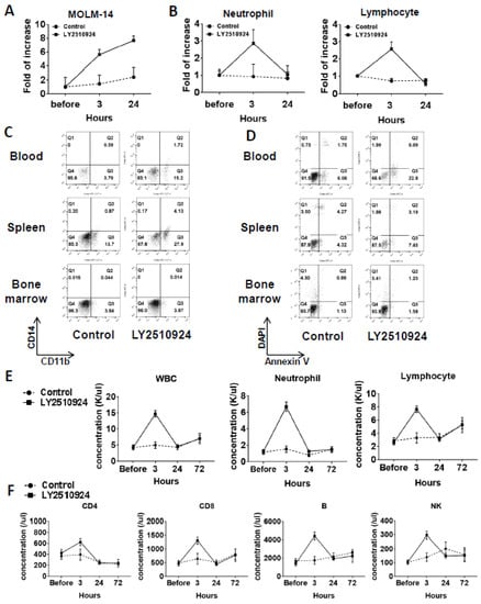 LY2510924 induces durable mobilization of leukemia cells and differentiation without causing apoptosis in vivo, whereas it causes transient effects on non-leukemic blood cells. (A–D) In a separate group from mice xenografted with MOLM-14/Luc/GFP cells (1.0 × 106 cells per mouse), the percentages of circulating MOLM-14/Luc/GFP cells analyzed by flow cytometry (A) and the neutrophils and lymphocytes by the HemaVet 950 Auto Blood Analyzer (B) before and three or 24 h after the first LY2510924 (2.5 mg/kg, subcutaneous, daily) injection on day 25 in three mice were compared to those in untreated mice (n = 3). After daily treatment of LY2510924 for two days, CD11b and CD14 expression (C) and the degree of apoptosis in GFP-positive cells (D) in the BM, spleen, and blood were compared to the untreated group. To further explore the different effects of normal blood cells in immune-competent mice, C57/BL/6 mice were treated with LY2510924 (2.5 mg/kg, subcutaneous, daily) and blood cell counts were analyzed (E) and flow cytometry was conducted (F) on each immune cell subsets.