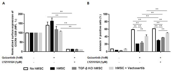 Silencing of transforming growth factor beta (TGF-β) signaling reduces the stroma-mediated protective effects and further enhances apoptosis by the combined treatment. (A,B) MOLM-14 cells were cultured alone (mono-culture) or co-cultured with human mesenchymal stromal cells (hMSC) and TGF-β knock-down hMSC (TGF-β KD hMSC) as indicated in the Materials and Methods. Mono-cultured and co-cultured cells were treated for 72 h with 1.0 nM quizartinib in the presence or absence of 1 µM LY2510924. A group with mono-cultured cells and co-cultured cells with hMSC were also treated with 1 µM vactosertib. Surface CXCR4 12G5 staining (A) and percentages of apoptotic cells (B) were assessed by flow cytometry. All results are expressed as the mean ± SD. ** p < 0.01.