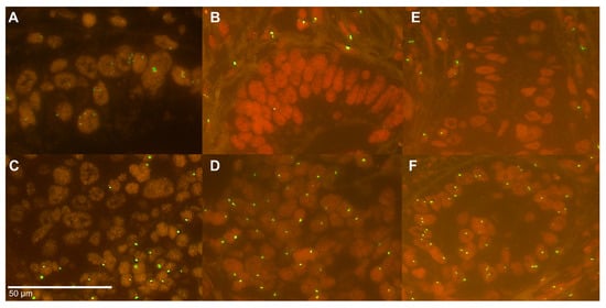 FISH of the Tissue Microarray: (A) preserved Y chromosome signals of the short (red signal) and long (green signal) arm; (B,C) complete loss of the Y chromosome; (D) mosaic pattern of the Y chromosome with partial loss (only long arm with green signals); (E,F) heterogeneity of the Y chromosome with partly lost and preserved signals in the tumor cells (magnification ×630).