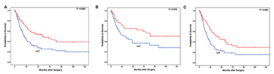 Kaplan-Meier survival analysis showing shortened overall survival (OS) in case of LoY (blue line) vs. preserved Y chromosome (red line) in the entire patients’ cohort (A). The effect of impaired OS is detectable in both, patients after upfront surgery without neoadjuvant treatment (B) and in patients who received neoadjuvant treatment (C).