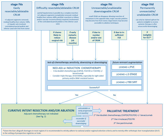 - Stage IVc disease: initially unresectable/unablatable, but potentially downstageable CRLM where induction systemic therapy and/or future remnant augmentation are appropriate;