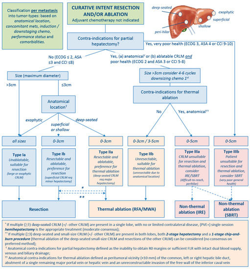 - Adam, R.; De Gramont, A.; Figueras, J.; Guthrie, A.; Kokudo, N.; Kunstlinger, F.; Loyer, E.; Poston, G.; Rougier, P.; Rubbia-Brandt, L.; et al. The oncosurgery approach to managing liver metastases from colorectal cancer: A multidisciplinary international consensus. Oncologist 2012, 17, 1225–1239. [Google Scholar] [CrossRef]