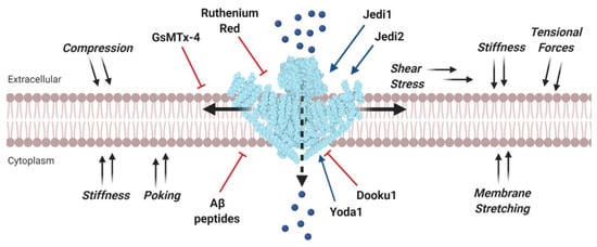 Like other MS ion channels, Piezo are pore-forming membrane proteins that are activated in response to mechanical stimuli applied to the cell membrane [36]. Specifically, Piezo channels are non-selective Ca2+-permeable channels whose gating can be stimulated by several mechanical stimuli affecting the plasma membrane, including compression, stretching, poking, shear stress, membrane tension, and suction (Figure 1) [34,37,38]. While other MS channels can be activated both by mechanical stretch and other physical and chemical stimuli, Piezo channels are the only ones to be primarily gated by mechanical stimuli [34,39,40]. Nevertheless, a recent study has demonstrated that Piezo channels show significant voltage sensitivity, thus they can also be viewed as important members of the voltage-gated ion channel family [41].