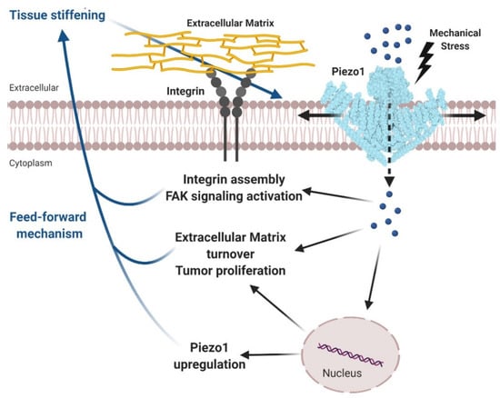 In another elegant study, Chen and colleagues used Drosophila models of glioma to establish the roles of Piezo channels in tumors [86]. The results obtained in this study provided a clear picture in which the tumor stiffer microenvironment upregulates and activates Piezo1 to further enhance tissue mechanotransduction capacity, exacerbating glioma development and tumor cell proliferation. The authors postulated a potential mechanism where the mechanical activation of Piezo1 foments the Ca2+-dependent assembly of focal adhesions and triggers integrin-FAK signaling. In conclusion, based on the results obtained in this study, glioma cell stiffness initiates a feedforward process wherein Piezo1 over-activation leads to cancer progression (Figure 3) [86].