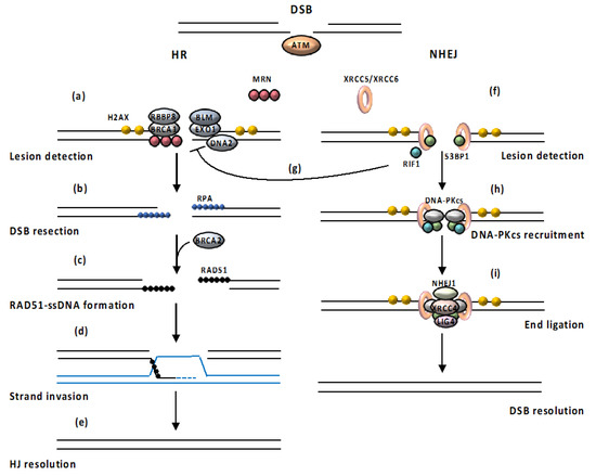 HR is active only during the S and G2 phases, when sister chromatids are available as templates for repair [26,34]. Following the recruitment and activation of one of the damage sensor proteins, such as ATM kinase, the nuclease MRN, along with its cofactor RBBP8 (RB binding protein 8) and other accessory proteins such as BRCA1 (BRCA1 DNA repair associated), initiates the 5′-3′ resection of the DNA ends, resulting in the creation of 3′-OH single- stranded DNA (ssDNA) tails on both ends of the break [35,36]. Next, long range resection is achieved by two alternate pathways involving EXO1 (exonuclease 1) alone or BLM (BLM RecQ like helicase) working in conjunction with EXO1 or DNA2 (DNA replication helicase/nuclease 2) [37]. Afterwards, the ssDNA-ends are coated and stabilized by RPA (replication protein A), a heterotrimeric complex [38]. In the next step, RPA is replaced from ssDNA ends by RAD51 (RAD51 recombinase) in a BRCA2 (BRCA2 DNA repair associated)-dependent process [39]. After that, formation of the RAD51 multimeric filament on ssDNA occurs; RAD51-ssDNA filament can then strand invade a homologous dsDNA, leading to displacement on one strand of the intact DNA duplex and formation of a D-loop, required for prime DNA synthesis by the 3´ OH of the invading strand, in order to restore the integrity at the break point [26,39]. Finally, strand exchange occurs and the resulting Holliday junction is resolved (HJ) [34]. However, HR can also proceed by break-induced replication and synthesis-dependent strand annealing [40]. The use of sister chromatids as templates for repair by HR allows error-free repair. By contrast, the NHEJ pathway relies on the ligation of DNA ends without the use of a template, resulting in a faster, but potentially inaccurate re-ligation of DSBs [41]. The NHEJ pathway initiates with the ATM-mediated phosphorylation of the N-terminal domain of the signaling factor 53BP1 (TP53-binding protein 1), which is required for the recruitment of the anti-resection proteins RIF1 (replication timing regulatory factor 1) and PAXIP1 (PAX-interacting protein 1) to the DSBs [41]. 53BP1 then promotes NHEJ, initiated by the binding of a heterodimer, consisting of XRCC6 and XRCC5 (X-ray repair cross-complementing protein 6 and 5), to the two ends of the DSB and the interaction with the catalytic subunit of DNA-PKcs [42]. DNA-PKcs acts as a scaffold protein that tethers the broken ends together. A cascade of protein phosphorylation reactions activates and recruits other NHEJ component proteins, resulting in the excision of single-stranded overhangs of broken ends. Ultimately, the LIG4 (DNA ligase 4)/XRCC4 (X-ray repair cross complementing 4)/NHEJ1 (non-homologous end joining factor 1) complex ligates the DNA ends [43,44]. The recruitment of 53BP1 to specific histone marks is thought to tip the balance in favor of NHEJ [45,46]. The establishment of the 53BP1 barrier inhibits DNA resection, the critical step in HR, allowing NHEJ to be the first-choice pathway even in the S/G2 phase. However, if NHEJ does not occur, repair switches to HR through the RBBP8-dependent stimulation of MRE11 endonuclease activity [46,47].