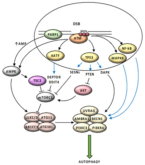 Schematic representation of main pathways regulating the DDR-mediated autophagic response. ATM is activated in response to DNA damage by the MRN complex and initiates a pathway that results in activation of AMPK and its target TSC2 (TSC complex subunit 2), which removes the inhibitory effect of MTORC1 on autophagy, promoting ULK1-dependent autophagosome formation. ATM directly phosphorylates and stabilizes TP53, which activates the expression of several regulators of the autophagic pathway including SESNs (Sestrin family genes), DAPK (death-associated protein kinase 1) and PTEN (phosphatase and tensin homolog). ATM contributes to the activation of AATF (apoptosis antagonizing transcription factor) and leads to increased transcription of two mTOR inhibitors, DDIT4 (DNA damage inducible transcript 4) and DEPTOR (DEP domain containing MTOR interacting protein). DNA damage response activates MAPK8 (mitogen-activated protein kinase 8) and NFκB (nuclear factor kappa-light-chain-enhancer of activated B cells) pathways, that induce expression of several autophagy related genes, including BECN1. PARP1 activation in response to DNA damage causes reduction in NAD+ (nicotinamide adenine dinucleotide) and ATP (adenosine triphosphate) pool depletion; elevated AMP (adenosine monophosphate) levels are sensed by AMPK, leading to its activation and induction of autophagy. Black arrows (↑) and perpendicular lines (⊥) indicate activation and repression, respectively. Blue arrows indicate transcriptional regulation.