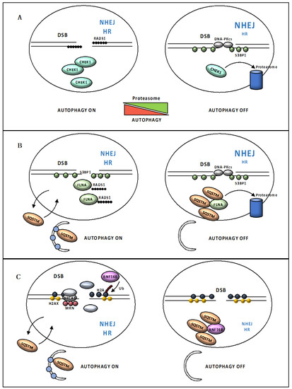 Overall, loss of autophagy appears to result in multiple layers of regulation that combine or counterbalance each other determining different functional consequences on DNA repair depending, apparently, on cellular context and stress-specific components. It is not surprising that an increasing body of evidence highlights the multifaceted impact of autophagy on DNA repair, in normal and cancer cells. For instance, the lack of autophagy has been shown to lead to down-regulation of proteins critical for HR, and also for NHEJ, in hematopoietic cells [82]. On the other hand, down-regulation of important autophagy players changes the percentage of irradiated cells with nuclear foci positive for 53BP1, an NHEJ marker, but not RAD51, an HR marker, in colorectal cancer cells [83]. Autophagy inhibition negatively regulates repair by NHEJ in PTEN-deficient, but not in PTEN-proficient, prostate adenocarcinoma cells [84]. Further work is required to identify precisely the mechanisms allowing autophagy to promote DNA repair and what factors determine these apparently different functions of autophagy.