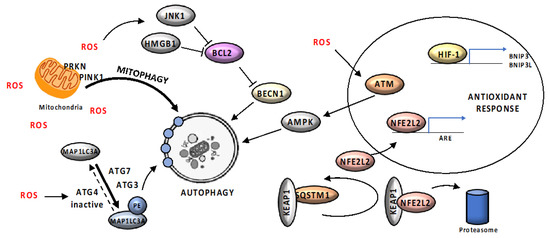 Excessive ROS production may result in significant irreversible damage to organelles, alteration of membranes and DNA damage, due to their ability to react with and oxidaze biomolecules [105]. Cumulatively, these events are known as oxidative stress and are involved in mutations, cancer and many other diseases. Under physiological conditions, low levels of ROS are involved in cellular signal regulation. ROS level is regulated by antioxidant enzymes superoxide dismutases, catalase and glutathione peroxidases, which catalyze transformation of reactive oxygen species into stable non-toxic molecules and restore the reduced protein and lipid pool, therefore representing the most important defense against oxidative stress [106]. When ROS are produced at an extent high enough to overcome the antioxidant defense, autophagy becomes a crucial response to oxidative stress, by removing irreversibly oxidized proteins and organelles (Figure 5).