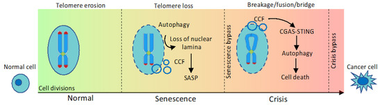Autophagy acts as a barrier to malignant transformation. Telomeres shorten as a result of cellular replication, leading to replicative senescence. Autophagy promotes senescence through degradation of the nuclear lamina; loss of nuclear lamina leads to extrusion of fragments of chromatin and portions of nucleus, generating CCFs (cytoplasmic chromatin fragments) which are exposed to DNA-sensing pathway, promoting SASP (senescence-associated secretory phenotype). When senescence is bypassed, due to dysfunctional cell cycle check-points, cells continue to divide and could undergo breakage/fusion/bridge cycle, that involves repeated formation of chromosomal fusions and subsequent breaks initiated by the loss of telomere protection. Telomere dysfunction generates CCFs that activate the DNA-sensing CGAS–STING (cyclic GMP-AMP synthase-stimulator of interferon response cGAMP interactor 1) pathway, required for a form of cell death known as replicative crisis, preventing malignant transformation.