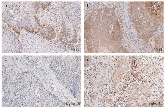 The expression of PD-L1 and Siglec-15 in peSCC tissues by immunohistochemistry. Representative immunohistochemistry (IHC) images show marginal (a) and diffuse (b) expression of PD-L1 expression (b). The low (c) and high (d) expressions of Siglec-15 in intratumoral or stromal tumor-infiltrating myeloid cells were also presented. Magnification: 200×.