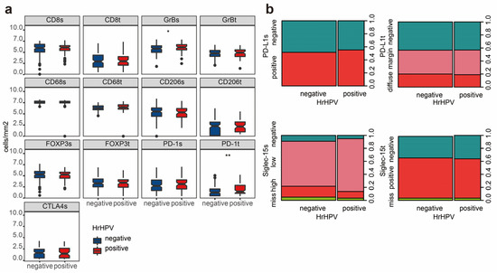 The expression of immune markers in hrHPV− and hrHPV+ samples. (a) The box plots indicate the transformed densities of stromal CD8 (CD8s), intratumoral CD8 (CD8t), GrBt, GrBs,CD68t, CD68s, CD206t, CD206s, FOXP3t, FOXP3s, PD-1t, PD-1s and CTLA-4s. Compared with the hrHPV− patients, the hrHPV+ patients expressed a higher density of stromal GrB and intratumoral PD-1. * p < 0.05, ** p < 0.01, independent t-test. (b) Spineplot diagrams show the expression patterns of PD-L1 and Siglec-15 in the intratumoral and stromal regions. There was no difference between the expression of PD-L1 and Siglec-15 between hrHPV− and hrHPV+ tumors.