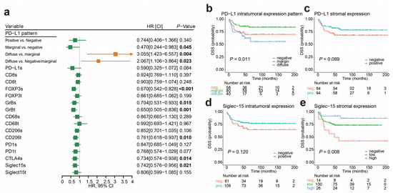 The correlation of patient prognosis and expression of immune markers in peSCC. (a) The densities of immune markers were treated as continuous variables. Forest plot shows the hazard ratios (HR) for disease-specific survival (DSS). Values shown in bold are statistically significant. (b–e) Kaplan–Meier survival analyses (log-rank tests) were conducted, according to PD-L1 expression in tumor (b), PD-L1 expression in stroma (c), Siglec-15 expression in tumor (d), and Siglec-15 expression in stroma (e).