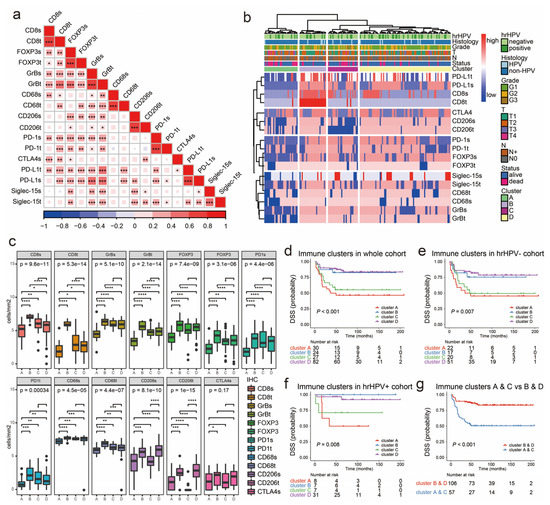 The immunophenotypes of the tumor immune microenvironment (TIME) in peSCC. (a) Correlation matrix plots by Spearman correlation analyses show pairwise positively stronger correlation of the expression of tested markers. * p < 0.05, ** p < 0.01, *** p < 0.001. (b) Cluster analyses using correlation distance and ward.D were conducted based on the expression of immune markers. The heatmap shows the high expression (red) or low expression (blue) of each immune marker. Annotations of the samples on the top of the heatmap indicate histopathological features, including hrHPV status, histological subtypes, grade, T stage, N stage, survival status, and the four clusters identified by the cutree method. (c) Box plots show the expression of immune markers, according to identified four clusters. The transformed densities of CD8, GrB, FOXP3, PD-1, CD68, CD206, and CTLA-4 in the intratumoral and stromal regions were indicated by box plots. * p < 0.05, ** p < 0.01, *** p < 0.001, **** p < 0.0001, Kruskal-Wallis test. (d–f) Kaplan–Meier survival curves for disease-specific survival (DSS) show patients in clusters A and C had better prognosis than clusters B and D in all cases (d), hrHPV− cases (e) and hrHPV+ cases(f). (g) Patients in high-risk group (clusters A and C) were likely to experience tumor progression, compared with those in low-risk group (clusters B and D).