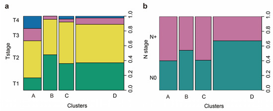 No statistically significant difference among the four groups for hrHPV infection was found. Cluster A had a greater proportion of advanced T stages (T3 or T4) than the other three clusters (33.3% vs. 9.3%, p = 0.001), as shown in Figure 5a. The incidence of LNM was significantly higher in clusters A and C than in clusters B and D (60 and 59.3 vs. 45.8 and 32.9%, p = 0.021), as shown in Figure 5b.