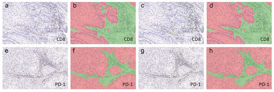 Immunohistochemical quantitative analyses of CD8 (a–d) and PD-1 (e–h) expression in intratumoral and stromal regions. Analyses were performed using inForm 2.1 Image Analysis Software (Mantra Software/PerkinElmer). Images of IHC staining, as well as the simulative tissue segmentation (tumor: red, stroma: green) (b,f), positive cell segmentation (c,g) and merged images (d,h), were shown. Magnification: 200×.