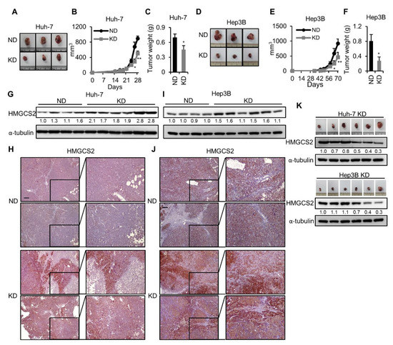 Mice fed a KD inhibited tumor growth, which was accompanied by increased HMGCS2 expression. Mice were fed an ND or KD two weeks before subcutaneous implantation of 5 × 106 Huh-7 and Hep3B cells. n = 6/group. (A,D) Representative images of tumors from either feeding the normal diet (ND) or feeding the ketogenic diet (KD). (B,E) The tumor growth rate and (C,F) the tumor weight of each group. (G,I) Western blot analyses of HMGCS2 using protein lysates derived from tumors of the ND and KD groups. The whole blot images can be found in Figure S10. (H,J) Representative HMGCS2 IHC-stained sections of tumors from each treatment group. Scale bars: 0.1 mm. (K) Paired HMGCS2 western blotting images and tumor mass among the KD groups. The quantification of the western blot images was presented by using the ImageJ system. The Mann–Whitney U test was used to compare two independent groups. * p < 0.05; ** p < 0.01 vs. the black bar.