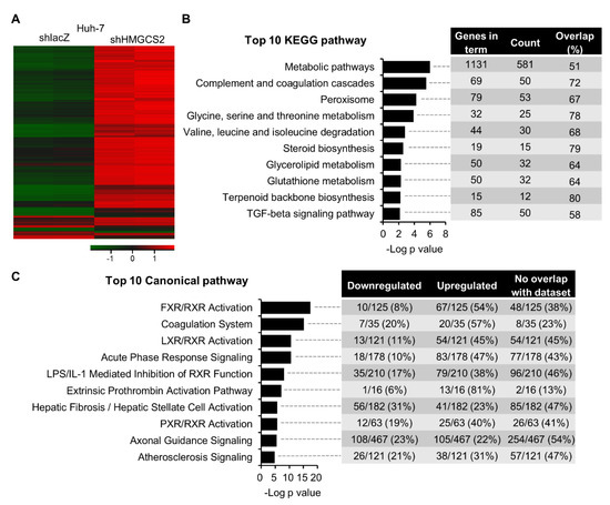 Detailed gene expression profile of HMGCS2 knockdown Huh-7 cells. (A) Heat map of the mRNA expression profile of shlacZ and shHMGCS2 cells based on mRNA microarray analysis. The differential expression of genes listed in the hierarchical clustering map was defined by the ratio of the expression in shHMGCS2 cells to that in shlacZ control cells as a log2 (fold change) of ≥ 2 (upregulation, red) or ≤ 0.5 (downregulation, green). (B) Top 10 Kyoto Encyclopedia of Genes and Genomes (KEGG) pathways. The height of the histogram corresponds to the relative expression value for a particular pathway that significantly changed. (C) Top 10 canonical pathways classified by IPA after HMGCS2 knockdown in Huh-7 cells.