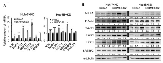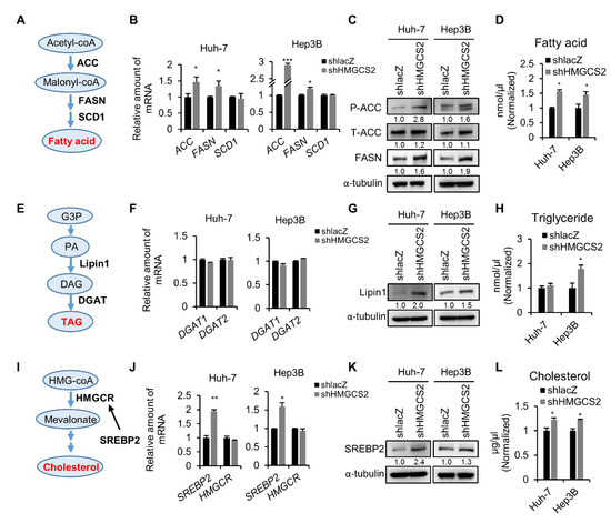 Hepatic fatty acid, triglyceride, and cholesterol metabolism are important factors for maintaining the homeostasis of the lipid pool [31]. Dysregulation of lipid metabolism may trigger cancer development, including HCC [32,33]. Thus, we further clarified the regulatory mechanisms of HMGCS2 expression on the fatty acid synthesis, triglyceride synthesis, and cholesterol synthesis. For fatty acid biosynthesis (Figure 3A), acetyl-CoA is converted into malonyl-CoA by acetyl-CoA carboxylase (ACC). The condensation of acetyl-CoA and malonyl-CoA by fatty acid synthase (FASN) leads to the production of palmitic acid. A double bond is introduced by stearoyl-CoA desaturase (SCD1) to generate monounsaturated fatty acids. We demonstrated that the knockdown of HMGCS2 significantly increased the mRNA expression levels of ACC and FASN (Figure 3B) and the protein expression levels of phosphorylated ACC and total FASN (Figure 3C). The results of intracellular fatty acid quantification showed that the knockdown of HMGCS2 in both Huh-7 and Hep3B cells significantly increased the fatty acid amount (Figure 3D). For triglyceride biosynthesis (Figure 3E), glycerol-3-phosphate undergoes esterification to form phosphatidic acid. Phosphatidic acid phosphohydrolase (PAPase, which is also known as Lipin), hydrolyzes phosphate to form diacylglycerol. Diacylglycerol acyltransferase (DGAT) catalyzes the third esterification to form triacylglycerol [34]. Although HMGCS2 knockdown cells did not influence the mRNA expression levels of DGAT1 and DGAT2 (Figure 3F), the protein expression level of Lipin1 was increased in both Huh-7 and Hep3B shHMGCS2 cells (Figure 3G). Triglyceride quantification assays showed that Hep3B shHMGCS2 cells possessed higher triglyceride levels than the control (Figure 3H). In cholesterol biosynthesis (Figure 3I), sterol regulatory element-binding protein 2 (SREBP2) is the primary transcription factor that induces the expression of 3-hydroxy3-methylglutaryl-CoA reductase (HMGCR). HMGCR is the key enzyme that converts 3-methylglutaryl-3-hydroxy-CoA (HMG-CoA) to mevalonate, and subsequent reactions result in the production of cholesterol. The mRNA and protein expression levels of SREBP2 were elevated in the HMGCS2 knockdown cells, while the HMGCR mRNA expression remained unchanged (Figure 3J,K). The cholesterol quantification results showed that the knockdown of HMGCS2 enhanced the cholesterol amount in both Huh-7 and Hep3B cells (Figure 3L). These data indicate that the loss of HMGCS2 results in the dysregulation of lipid synthesis in HCC cells. On the other hand, HMGCS2 overexpression did not affect fatty acid, triglyceride, and cholesterol synthesis in either Huh-7 or Hep3B cells (Figure S4).