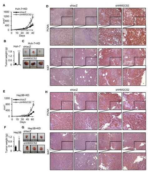 The knockdown of HMGCS2 enhanced tumor growth under KD feeding. (A,E) The tumor growth rate and (B,F) the tumor weight from mice fed either an ND or KD. Huh-7+KD: n = 7/group. Hep3B+KD: n = 5/group. (C,G) Representative images of tumors from each group. (D,H) Representative PCNA and Ki67 IHC staining of tumors from each treatment group. The Mann–Whitney U test was used to compare two independent groups. * p < 0.05; ** p < 0.01; *** p < 0.001 vs. the black bar.