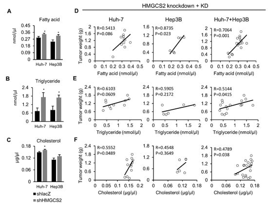 HMGCS2-downregulated tumors showed elevated lipid content and positively correlated with tumor weight. (A–C) The fatty acid, triglyceride, and cholesterol in the tumor mass. (D–F) Pearson correlation between each lipid content and tumor weight in the indicated groups. The Mann–Whitney U test was used to compare two independent groups. * p < 0.05 vs. the black bar.