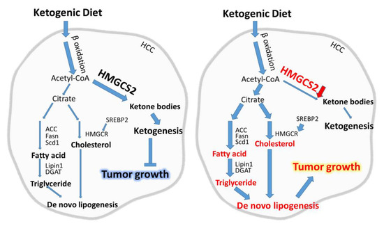 HMGCS2 downregulation increased de novo lipogenesis, which reversed the antitumor effect of a KD. In HCC tumors with HMGCS2 expression (left panel), KD supplementation increases ketogenesis mediated by HMGCS2, and therefore, inhibits HCC tumor growth. In the absence of HMGCS2 (right panel), the HCC tumors will be under the condition of ketogenic insufficiency. Under this circumstance, the use of a KD will increase de novo lipogenesis and ultimately trigger HCC tumor growth.