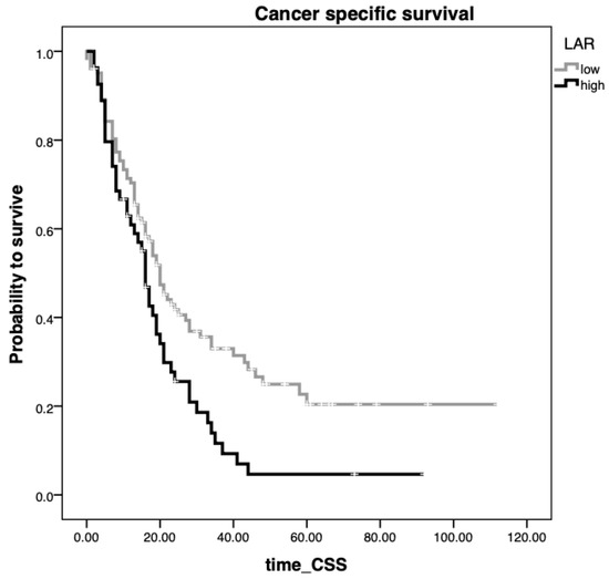 Kaplan–Meier curves predicting cancer-specific survival (CSS) regarding a preoperative LAR < 2.74 vs. LAR ≥ 2.74 in the study cohort comprising 157 patients undergoing surgical resection (p = 0.008).