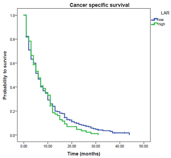 To determine the independent prognostic value of the preoperative LAR regarding CSS, a multivariate analysis using a Cox proportional hazard model was performed. In the multivariate analysis including age, gender, CA19-9 level, tumor stage, application of chemotherapy, KI and the preoperative LAR, we identified high tumor stage, the administration of chemotherapy, KI and the preoperative LAR to represent independent prognostic factors regarding CSS (HR = 1.63; 95% CI = 1.17–2.77; p = 0.007; Table 2). To expand our study and test the hypothesis whether the LAR represents a prognostic factor in metastatic non-surgical resectable pancreatic ductal adenocarcinoma (PDAC), we analyzed 351 metastatic PDAC cases, the median LAR was 2.05 (interquartile range: 1.42–2.89, minimum: 0.36, maximum: 25.67). Overall, 199 male and 152 female patients were included into analyses. The average age at diagnosis was 65 ± 10.1 yrs. Median survival was 6 months (range: 0–44 months) and at the time of analyses 338 (96.3%) out of all patients had died by their most recent follow-up. Chemotherapy was administered to 246/351 (71%) patients. Low grade (G1 + G2) tumors were more frequent in 221 (59%) patients than high grade (G3 + G4) carcinomas in 143 (41%) patients. A Karnofsky index (KI) ≥ 90 was observed in 221 (63%) patients and a lower performance status of KI < 90% was observed in 130 (37%) of patients. Lipase and amylase levels were obtained from all 157 patients. The median amylase level was 21 U/L (interquartile range: 12 to 41, range: 1–561 U/L) and the median lipase level was 37 U/L (interquartile range: 22 to 79, range: 5–1597 U/L). Applying ROC analysis, we calculated an optimal cut-off level for the LAR being 1.33 (Youden index 0.2518). For the LAR, the area under the ROC curve (AUC) was 0.587 (95% CI: 0.533 to 0.640), with a sensitivity of 79.03 and a specificity of 46.15. Applying the Kaplan–Meier curve method showed no survival difference between low and high LAR groups in metastatic PADC patients (log-rank test p = 0.335, Figure 2).