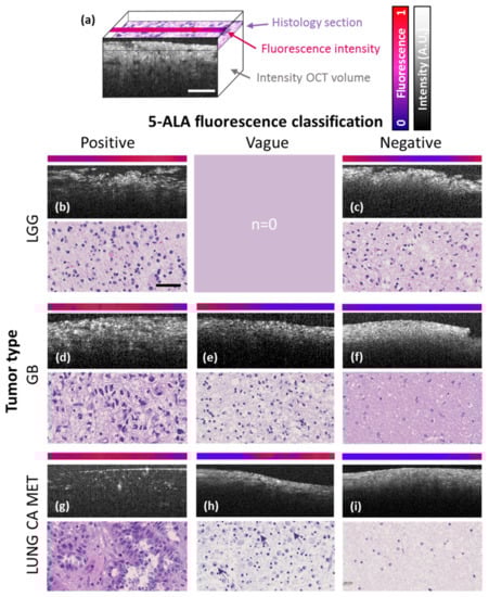 Cross-sections and digital pathology scans of representative tumor samples for each tumor entity evaluated in the study. Each panel features a 2.5-µm-thick line of the fluorescence micrograph and the corresponding OCM (optical coherence microscopy) B-scan image. Corresponding histological sections are shown below. (a) Schematic 3D representation provides orientation of feature extraction planes. (b,c) LGGs (lower-grade gliomas) with strong (b) and without (c) 5-ALA (5-aminolevulinic acid) fluorescence observed during fluorescence-guided surgery (FGS) respectively. (d–f) GB (glioblastoma) with strong (d), vague (e) and without (f) intraoperative 5-ALA fluorescence respectively. (g–i) Lung CA MET (lung cancer metastasis) with strong (g), vague (h) and without (i) 5-ALA fluorescence observed during FGS. Note, infiltration by macrophages in (h) indicated by purple arrows and necrosis in (i) throughout the tissue. Scale bars correspond to 50 µm.