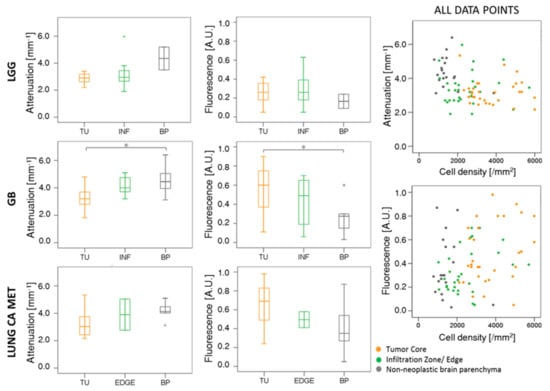Next, attenuation and fluorescence data were compared for the different tumor entities (see Figure 2, Tables S2 and S3). For all three tumor entities, attenuation coefficients decreased while fluorescence signals increased with content of malignant tumor cells. For LGGs, the median attenuation coefficient in non-neoplastic brain parenchyma was 4.35 ± 1.20 mm−1, as compared to 2.95 ± 0.86 mm−1 and 2.90 ± 0.38 mm−1 in infiltration zone and tumor core, respectively. The relative 5-ALA fluorescence intensity was measured 0.16 ± 0.10 in non-neoplastic brain parenchyma, 0.25 ± 0.15 in infiltration zone and 0.26 ± 0.12 in the compact tumor. In the GB cohort, a significant difference between non-neoplastic brain parenchyma and tumor core of both attenuation coefficient (4.45 ± 0.99 mm−1 in non-neoplastic brain parenchyma, 3.20 ± 0.76 mm−1 in tumor, p = 0.04) and fluorescence intensity (0.28 ± 0.17 in non-neoplastic brain parenchyma, 0.60 ± 0.23 in tumor, p = 0.02) was found. For the infiltration/border zone, the attenuation coefficient was intermediate at 4.00 ± 0.71 mm−1 and the relative 5-ALA fluorescence was 0.49 ± 0.27. In the metastatic cohort, the same trends were observed for attenuation coefficients (4.13 ± 0.64 mm−1 in non-neoplastic brain parenchyma, 3.90 ± 1.61 mm−1 in the border zone, 3.03 ± 1.15 mm−1 in tumor) and fluorescence values (0.35 ± 0.28 in brain parenchyma, 0.50 ± 0.12 in border zone and 0.69 ± 0.27 in tumor). The scatter plots on the right-hand side of Figure 2 show attenuation coefficients and fluorescence intensities plotted over cell density independent of tumor entity. Each data point in the scatter plots corresponds to one data set.