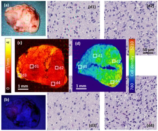Large field-of-view (FOV) scan of a representative astrocytoma, WHO grade III case with a vaguely fluorescent 5-ALA hotspot. (a) Photograph and (b) fluorescence image of a sample of the compact tumor immediately after resection. (c) Attenuation en-face projection and (d) whole sample cell density map with (d1–d4) corresponding regions of interest upon H&E staining.
