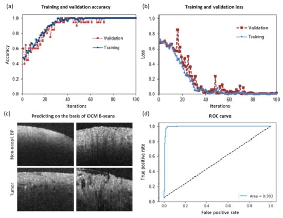 CNN (convolutional neural network)-based prediction of tumor versus non-neoplastic brain parenchyma. (a) Accuracy of training and validation processes over 100 iterations. (b) Loss during training and validation processes over 100 iterations. (c) Examples of OCM cross-sections of non-neoplastic brain parenchyma (Non-neopl. BP) versus tumor core. (d) ROC curve and area under the curve (AUC) of the CNN.
