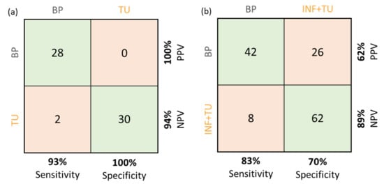 Contingency tables for both CNNs trained in this study. (a) Contingency table with positive predictive values (PPV) and negative predictive values (NPV) for the network trained on tumor (TU) and non-neoplastic brain parenchyma (BP) tissue B-scans. (b) Contingency table with PPV and NPV for the network trained on both infiltration zone and tumor (INF + TU) as compared to non-neoplastic tissue B-scans.