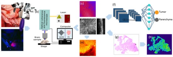 - Juarez-Chambi, R.M.; Kut, C.; Rico-Jimenez, J.J.; Chaichana, K.L.; Xi, J.; Campos-Delgado, D.U.; Rodriguez, F.J.; Quiñones-Hinojosa, A.; Li, X.; Jo, J.A. AI-assisted in situ detection of human glioma infiltration using a novel computational method for optical coherence tomography. Clin. Cancer Res. 2019, 25, 6329–6338. [Google Scholar] [CrossRef]