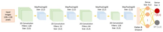 The architecture of the convolutional neuronal network. MaxPooling2D—2D extraction of most active (max) value from each cluster of neurons; Dense—dense blocks; T—tumor; BP—non-neoplastic brain parenchyma.