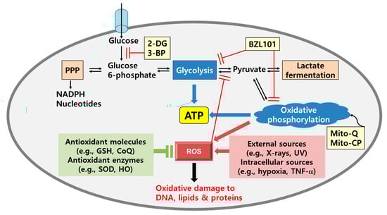 Metabolic fates of glucose metabolism. Under aerobic conditions, glucose is converted to pyruvate and then moved to the mitochondria, where it undergoes oxidative phosphorylation for ATP production. The mitochondria are the main source of ROS, which cause oxidative damage to biomolecules. O2•− and its product H2O2 can be neutralized by antioxidant molecules (e.g., GSH and coenzyme Q) and antioxidant enzymes (e.g., SOD and catalase). Under anaerobic conditions (including in cancer cells), pyruvate is used for lactate fermentation to produce ATP. Glucose 6-phosphate is bypassed to the pentose phosphate pathway to generate NADPH. Oxidative stress and metabolic inhibitors are involved in metabolic reprogramming in cancer cells. Abbreviations: 2-DG, 2-deoxyglucose; 3-BP, 3-bromopyruvate; BZL101, Bezielle; Mito-Q, mitoquinone mesylate; PPP, pentose phosphate pathway; ROS, reactive oxygen species.