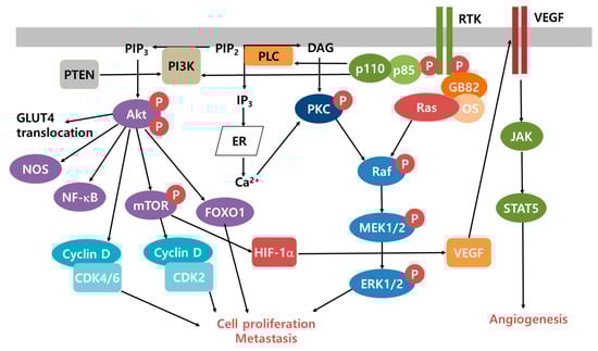 Proliferation, metastasis, and angiogenesis in cancer cells through the Akt, ERK, and STAT signaling cascades. PIP2 is converted to PIP3 by PI3K, which activates Akt signaling. Alternatively, PIP2 can be degraded by PLC into DAG and IP3. Remaining in the PM, DAG activates PKC. Next, IP3 binds to the IP3 receptor in the ER and triggers Ca2+ release from the ER, stimulating Ca2+-dependent PKC, which activates Raf, MEK, and ERK signaling cascades. After binding with the ligands, RTKs are autophosphorylated and recruit the GRB2 and SOS complex to change inactive Ras-GDP into active Ras-GTP. Activated Ras recruits p110 (a catalytic subunit of PI3K), and phosphorylates PIP2, which initiates survival signaling via Akt. Autophosphorylated RTKs can bind to p85 (a regulatory subunit of PI3K), which then attaches to p110 and forms the active complex. mTOR-activated HIF-1a stimulates VEGF, which binds to VEGF ligand and triggers JAK-STAT5 signaling for angiogenesis. Abbreviations: Akt, protein kinase B; CDK, cyclin-dependent kinase; DAG, diacylglycerol; FOXO1, Forkhead family of transcription factor 1; GRB2, growth factor receptor-bound protein 2; HIF-1α, hypoxia-inducing factor 1α; JAK, Janus kinase; MEK1/2, mitogen-activated protein kinase kinase 1 and 2; mTOR, mammalian target of rapamycin; p100, phosphor- NF-kB2; p85, regulatory subunit of PI3K; PKC, protein kinase C; PIP2, phosphatidylinositol 4,5-bisphosphate; PIP3, phosphatidylinositol 3,4,5-trisphosphate; PLC, phospholipase C; PTEN, phosphatase and tensin homolog; Raf, rapidly accelerated fibrosarcoma; Ras; SOS, salt overly sensitive; STAT5, signal transducer and activator of transcription 5.